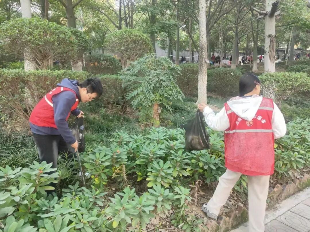 身着统一志愿马甲的同学们分工协作:一组穿梭于社区绿化带、公共广场,手持工具细致清理垃圾杂物,不放过灌木丛中的隐藏废弃物。