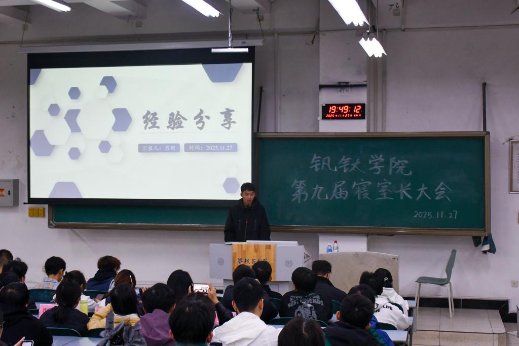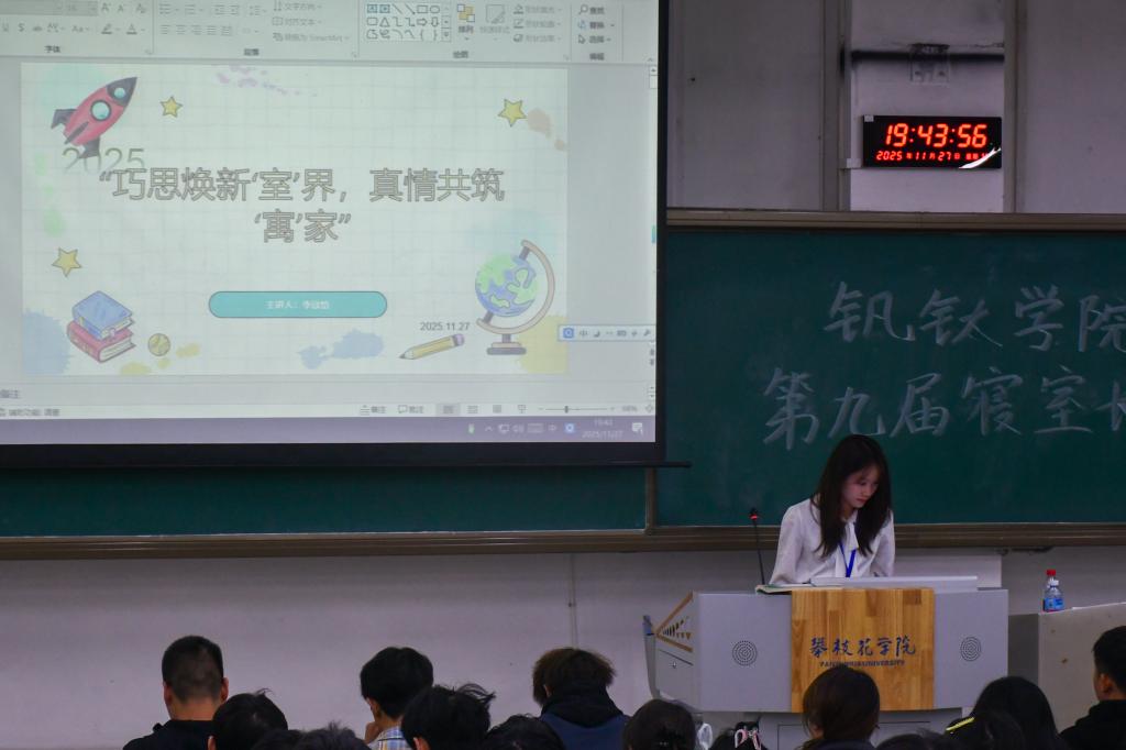 会上,纪检部李欣怡同学从卫生清洁、纪律规范、文化建设等核心维度,详细解读寝室评分标准与实施细则,为寝室日常管理提供清晰指引。优秀寝室长代表吕朋同学分享寝室氛围营造、责任分工协作等实用经验,为在场寝室长提供宝贵借鉴;特色寝室代表李紫霞同学通过生动案例展示文化建设创新成果,彰显钒钛学子积极向上的精神风貌。
