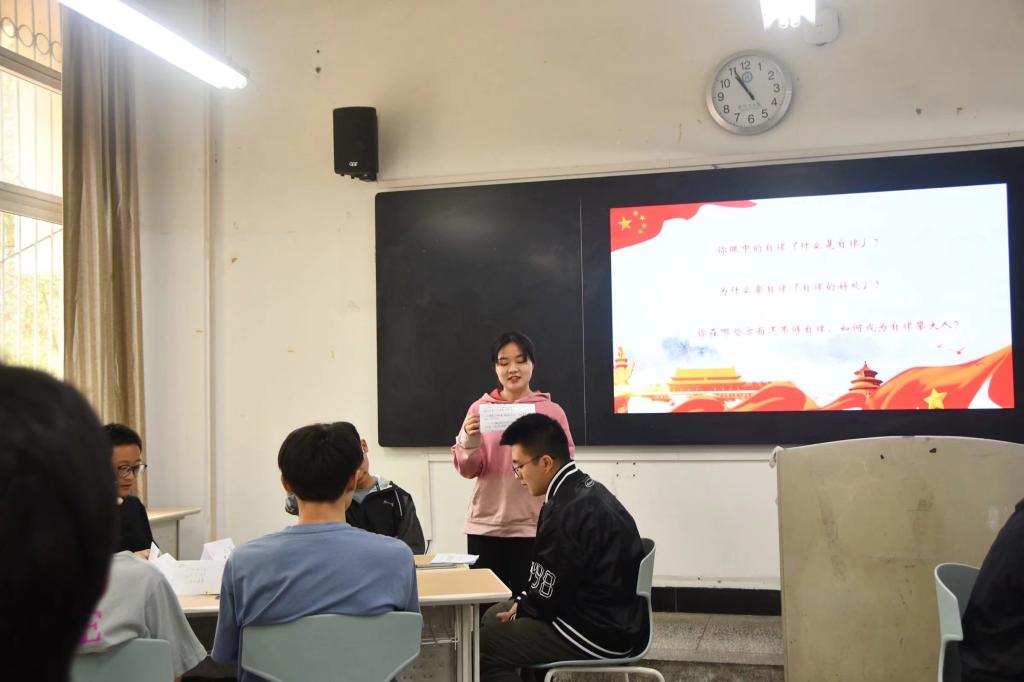 活动开始,班长艾瑞代表全班同学向参加本次班会的老师们表示欢迎。随后,自律班会正式开始,艾瑞就:你眼中的自律(什么是自律);为什么要自律(自律的好处);你在哪些地方还不够自律以及如何成为自律攀大人等问题组织同学讨论发言,并观看了由本班制作的以自律为主题的视频,同学们纷纷表示,要争做“自律攀大人”的典范。紧接着,分别由本班绩点排名第一第二的周柏坊、毛禄华同学为大家分享学习经验和读书心得。