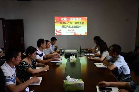 为培育和树立攀枝花学院自律品牌,落实立德树人的根本任务,钒钛学院于6月24日上午在院会议室组织师生共同观看和学习王斌书记在2021届毕业生典礼暨授位仪式上的讲话内容。钒钛学院院长蒋志强,党委副书记、纪委书记蒲洪主持学习。副院长蒋燕,学生科科长李宏,各年级辅导员、部分教师代表及部分学生代表聆听了此次会议。