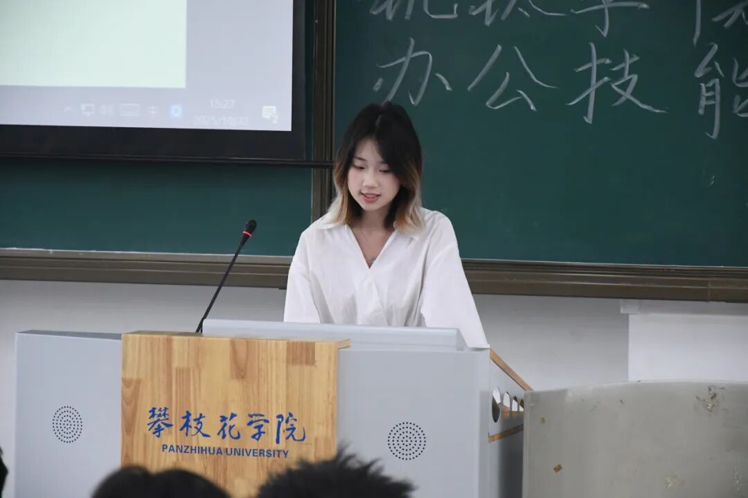 团课结束后,办公技能专题培训随即展开。本次培训立足学生工作实际,设置了四大核心模块。主席团代表牟忠祥在发言中首先对各位新干事的加入表示热烈欢迎。他指出:“本次培训大会不仅是你们角色转变的‘第一课’,更是赋能成长、凝聚力量的‘加油站’。站在新的起点,掌握扎实的技能是履行职责、服务同学的基石,也是我们组织永葆活力、不断创新的源泉。”随后,华韵汉服社杜娅菲同学首先讲解了活动策划书的撰写规范与流程要点;学术创新部赵珈庚同学围绕Word、Excel、PPT三大办公软件进行实操指导,涵盖文档排版、函数运用及演示文稿设计等内容;钒华主持人队邓腾雨同学就职场沟通礼仪、会议规范等进行了生动讲解;宣传部罗雨希同学针对许可证申请流程及常见问题作了清晰梳理。