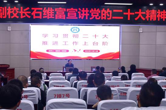 12月14日下午,副校长石维富在纪检监察学院教室作党的二十大精神宣讲报告。党政办、科研处、钒钛学院、数计学院部门领导和师生代表聆听报告。