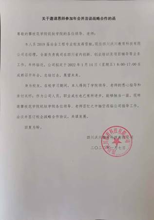 为更好的联络和凝聚校友、服务校友,实现校友和学校事业共赢发展,全面推进产教融合建设,实现毕业生高质量就业,2022年1月13日,钒钛学院张士举老师应邀参加四川沃川教育科技有限公司年会,就人才培养、实习、就业、企业技工培训等事宜开展了深入的交流洽谈,并签订了共建就业、实践教学基地合作协议。